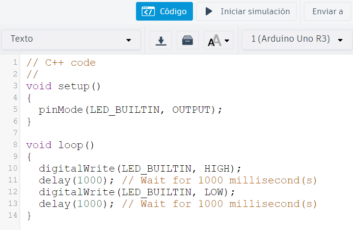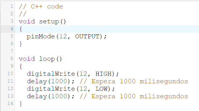 Ese es el aspecto que tiene nuestro programa, pero es un programa de ejemplo que aparece por defecto. Nosotros lo vamos a modificar para decirle que use el PIN 12. Luego veremos qué significa cada cosa: