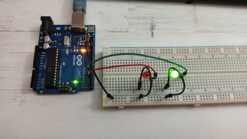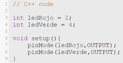 Lo que hemos hecho hasta ahora, ha sido situar los dos LEDs, cada uno con su resistencia de 220Ω. Hemos usado la salida digital 2 para el LED rojo, y la 4 para el LED verde. Además, hemos conectado el riel negativo a tierra y allí hemos conectado los dos polos negativos de los LEDs. Ninguna novedad.