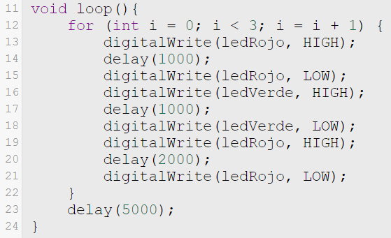 Para estas situaciones, como sabemos cuántas veces queremos ejecutar un fragmento de código, en este caso las líneas 12 a 20, podemos recurrir a un bucle for: