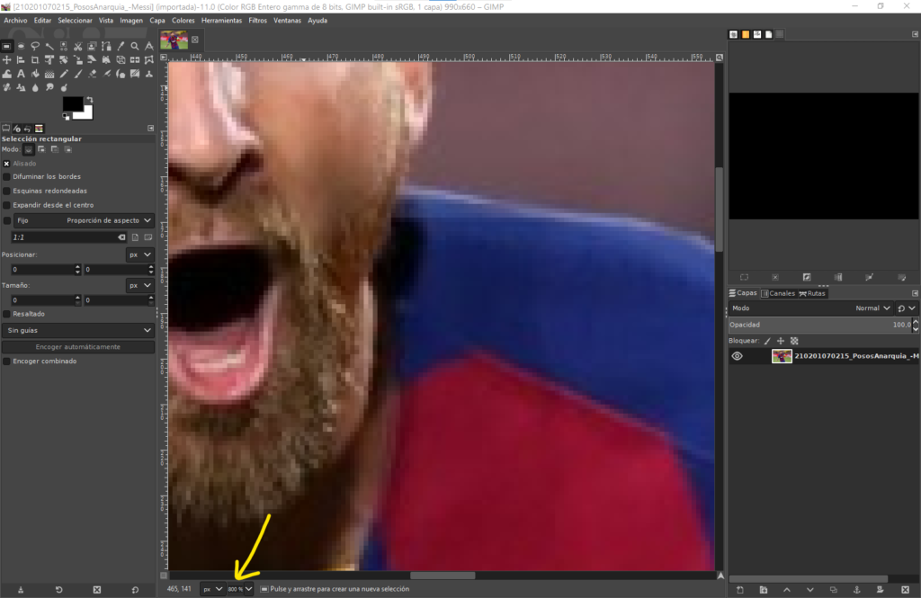 Volvemos a colocar el zoom en el 100% y veremos una fina línea blanca que rodea nuestra selección. Volvemos a clicar en Herramientas > Herramientas de selección > Selección libre y ahora la línea se habrá puesto discontinua.