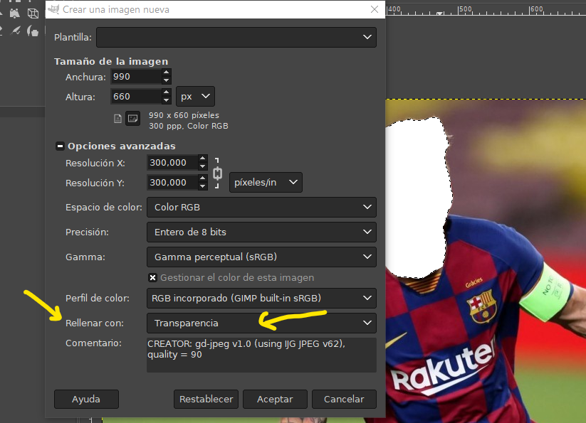 Ahora debemos cortar nuestra selección para crear una imagen PNG con el fondo transparente. Nos vamos a Editar > Cortar. Luego clicamos en Archivo > Nuevo y nos aseguramos de poner Transparencia en el apartado de Rellenar con: