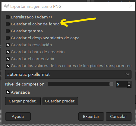Clicamos en Exportar y nos aseguramos de que NO está activada la opción Guardar el color de fondo. Así debe quedar.