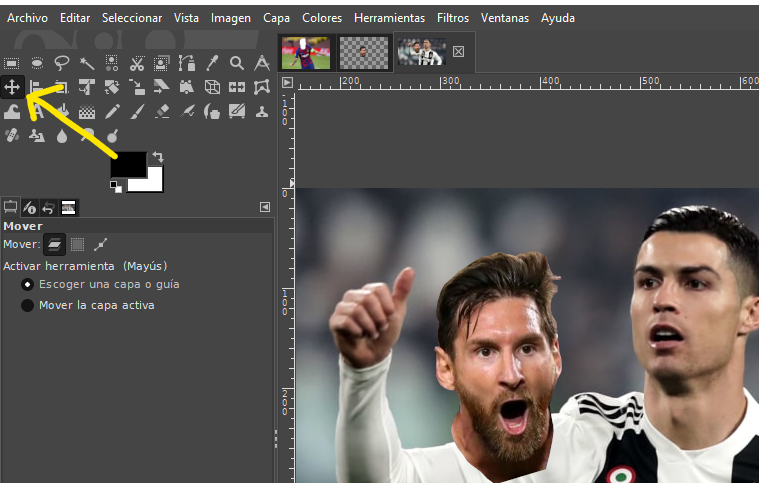 Ya tenemos una imagen con el fondo transparente que podemos usar para insertarla en la otra imagen. Abrimos la otra imagen y desde donde tengamos guardada la anterior la arrastramos a la última imagen que hemos abierto. Para moverla sobre la otra imagen usamos la herramienta Mover: