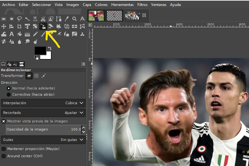 Es posible que quieras redimensionar la segunda imagen para ajustarla mejor al espacio que quieres que ocupe. Para ello puedes seleccionar la herramienta de escalado.