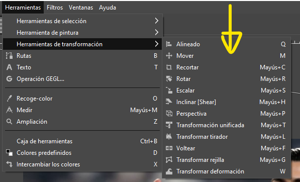O puede que también necesites, como en mi caso cambiar la orientación de la imagen para que mire a la izquierda (o incluso para ponerla boca abajo), para que gire, para que se incline sobre algún plano o cualquier otra transformación que quieras hacerle. Todo esto podemos lograrlo probando las opciones del menú Herramientas > Herramientas de transformación.
