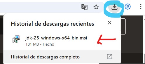 Nos desplazamos hacia abajo y nos aseguramos de que estén activas las pestañas: JDK 25 y Windows, y pulsamos en el enlace de descarga: