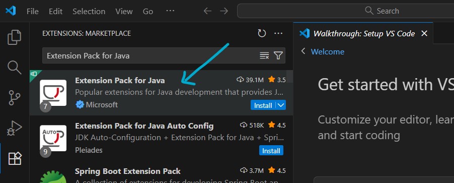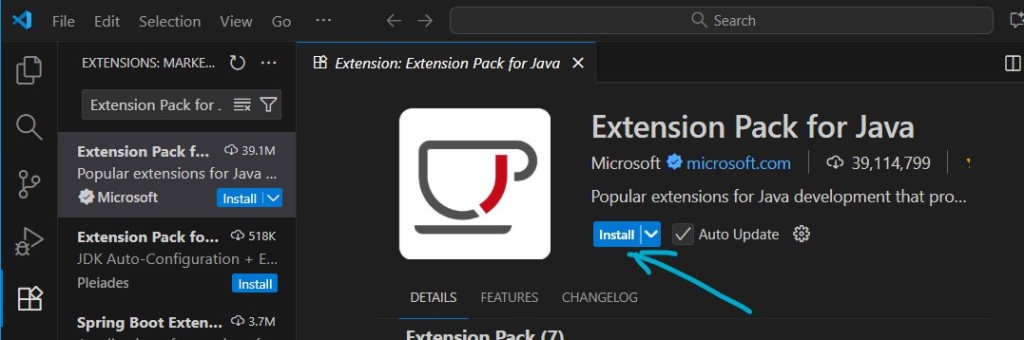 Y en el campo de búsqueda escribimos Extensión Pack for Java: