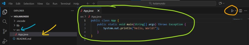 Ya tenemos nuestro proyecto creado listo para poder escribir código. A la izquierda veras el árbol de carpetas y archivos que el IDE ha creado automáticamente para facilitarnos la vida. El archivo principal de código fuente se encuentra en la carpeta src y se llama App.java. Abre ese archivo. Verás un código fuente de ejemplo que puedes ejecutar pulsando en el iconito del Play superior derecho: