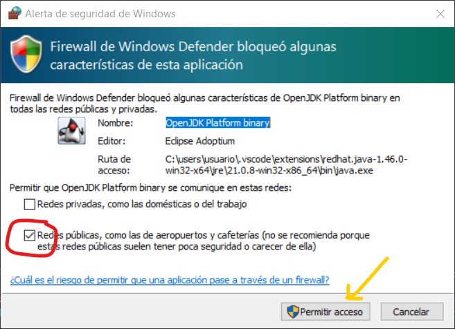 El ordenador te preguntará si quieres que el Firewall del equipo permita la ejecución de este programa (algo que se hace rutinariamente por seguridad). Le dices que sí: