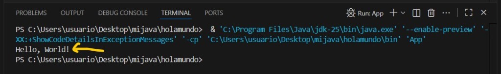 Finalmente podrás ver en la parte inferior del IDE, el resultado de la ejecución de tu programa. Si te sale el mensaje que escribiste, y no aparece ningún mensaje de error tienes tu entorno de programación funcionando correctamente: