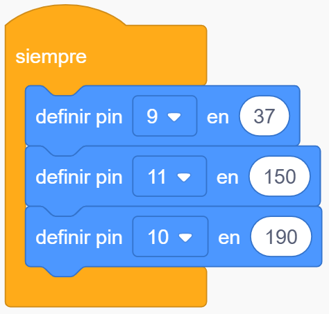 Efectivamente, por eso o sale el rojo -o verde o azul- más intenso, o sale apagado. Porque HIGH representa el valor más alto y LOW el valor más bajo. Y por ese motivo también, con esos bloques, sólo podemos iluminar el LED RGB con los colores primarios y secundarios.