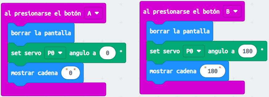 Bueno, ya tenemos todos los elementos que necesitamos para elaborar nuestro sencillo programa. Veamos cómo podemos mover el servo a una posición u otra cuando pulsamos el botón A o B (aunque el movimiento puede activarse cuando se produzca cualquier otro evento que queramos).
