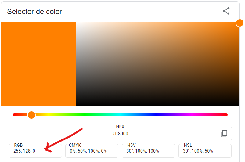 Así, variando la cantidad de cada canal, puedes obtener el color que quieras. O también, a la inversa, podrías utilizar el selector de color y observar los valores RGB para ver qué cantidad de rojo, verde y azul te llevan a ese color.