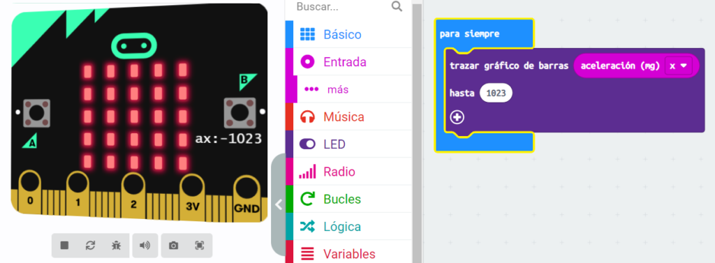 Los valores que controlan esta aceleración se expresan en mili-g, que es 1/1000 g, siendo g la misma aceleración que obtienes de la gravedad de la Tierra, y varían en un rango de 2048 posibles valores (de -1023 a 1023). De manera que la placa en plano, mostrará una aceleración de 0 en la dimensión X. Si está completamente inclinada a la derecha, X será 1023, y completamente inclinada a la izquierda -1023.