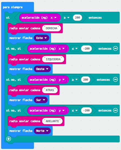 Lo que queremos que suceda en cada caso es exactamente lo mismo: enviar a la placa receptora la dirección para que el coche se mueva, y mostrar en la emisora una flecha que indique la dirección que acabamos de mandar. Pues ya podemos hacerlo: