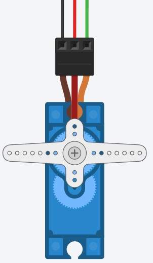 Del servomotor sabemos que tiene disponible tres pines: uno para recibir alimentación (el rojo), otro para conectarlo a tierra (el marrón o negro) y otro para recibir señales eléctricas y saber qué tiene que hacer (cable amarillo, naranja o blanco).
