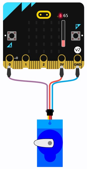 Detrás de la interfaz tendremos una placa Micro:bit alimentada con pilas y conectada a un servomotor que es el que mueve la flecha indicadora. Deberás crear un programa que almacenarás en el placa controladora para que lea los valores del sensor de sonido integrado en tiempo real, y en función de sus valores, ir accionando el servo motor para que mueva el indicador sobre el panel de niveles de ruido.