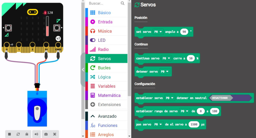 Antes de comenzar a construir nuestro programa, debemos activar una extensión específica para servomotores. Así que, nos dirigimos al panel de bloques, pulsamos sobre Extensiones y seleccionamos la que se llama Servos. Una vez hecho esto, ya tendremos nuestro panel de bloques para servo motores disponible: