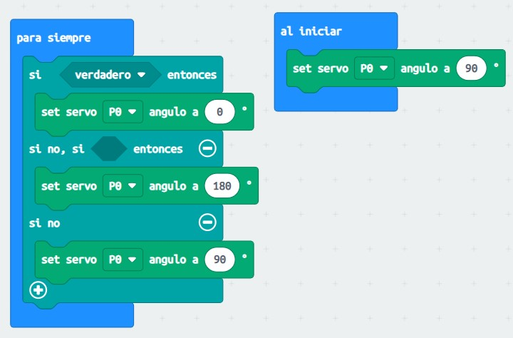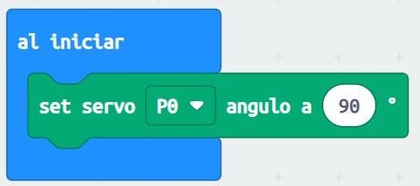 Lo primero que debe hacer la placa con el servo (si lo recuerdas) es decirle que vamos a comunicarnos usando el Pin 0 (podrías usar el 1 o el 2 si quisieras) y que se sitúe en un ángulo de 90º cuando se inicie el programa. Para ello, podemos usar estos bloques: