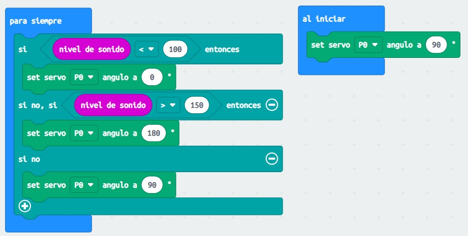 Nuestro programa ha comenzado, hemos establecido la comunicación entre los dos componentes y hemos colocado el servo donde nos interesa. Ahora, y de manera indefinida (bloque para siempre), debemos ir comprobando el nivel de sonido que llega al sensor de la placa e ir moviendo el servo en consecuencia.