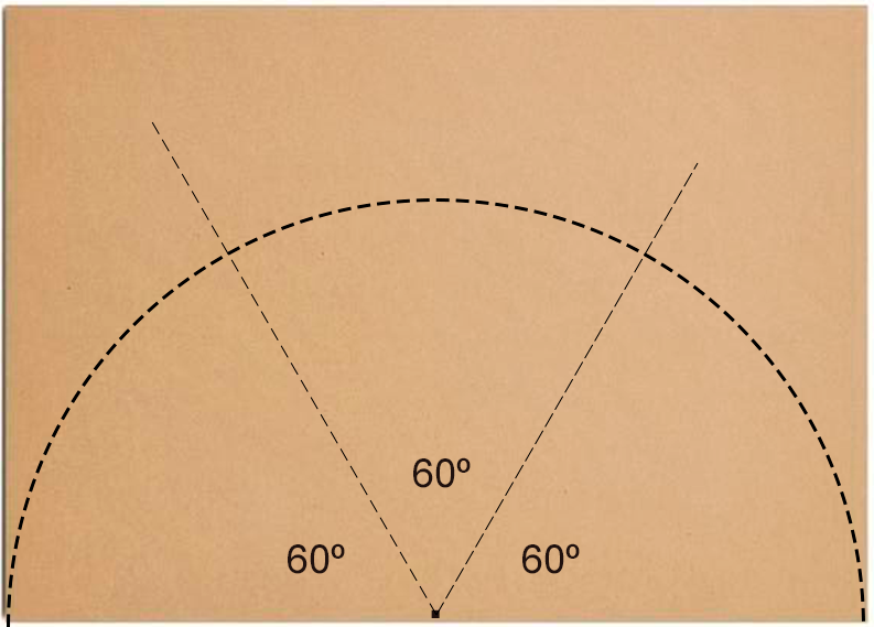 A continuación, necesitamos dividir nuestra media circunferencia en tantos sectores como niveles de sonido queramos mostrar en la interfaz. El número mínimo es tres, así que voy a trazar tres ángulos de 60º (si media circunferencia son 180º y lo quiero dividir en 3 partes, tengo que hacer 180º / 3) partiendo desde la base y utilizando el centro de la circunferencia como punto de referencia.