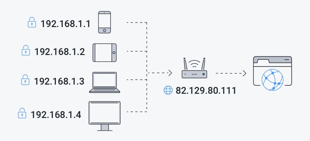 Por ejemplo, en tu casa, habrá numerosos dispositivos con conexión a Internet -ordenadores, tablets, móviles, consolas, TV, etc-. Todas ellas tienen una IP privada del tipo 192.168.X.Y, sin embargo, si un usuario desde fuera de tu casa «viera» tu red, sólo vería una única dirección IP pública -la de tu router-.