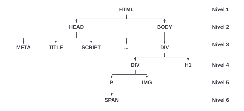 De esta manera, nuestro código HTML estará organizado jerárquicamente por niveles. Así, un elemento que esté en un nivel más profundo que otro, se dirá que es descendiente de aquel. Los elementos que estén en el mismo nivel serán hermanos, los que estén un nivel por debajo serán hijos y los que estén dos niveles por debajo serán nietos. Aplicando estas relaciones de parentesco podemos hacer referencia a la posición que ocupan los elementos dentro de la jerarquía arbórea del documento.