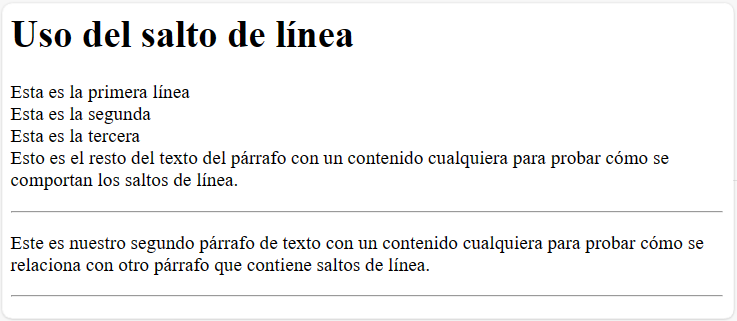 <p>Esta es la primera línea <br> Esta es la segunda <br> Esta es la tercera <br> Esto es el resto del texto del párrafo con un contenido cualquiera para probar cómo se comportan los saltos de línea.</p>