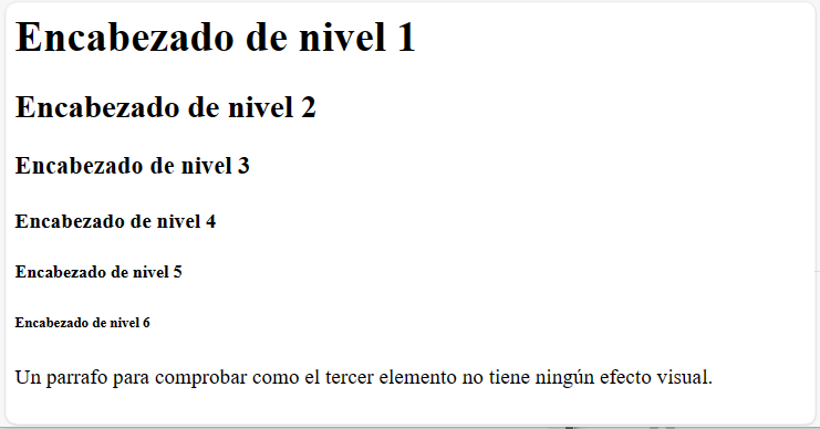 • h1, h2, h3, h4, h5, h6: elementos para encabezados. Cuanto más pequeño sea el número, más importante es el texto y en consecuencia más grande aparecerá en el navegador.